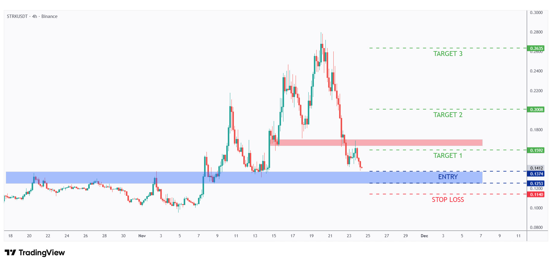 As per our last market outlook, STRK has been retesting a strong support zone at $0.125.