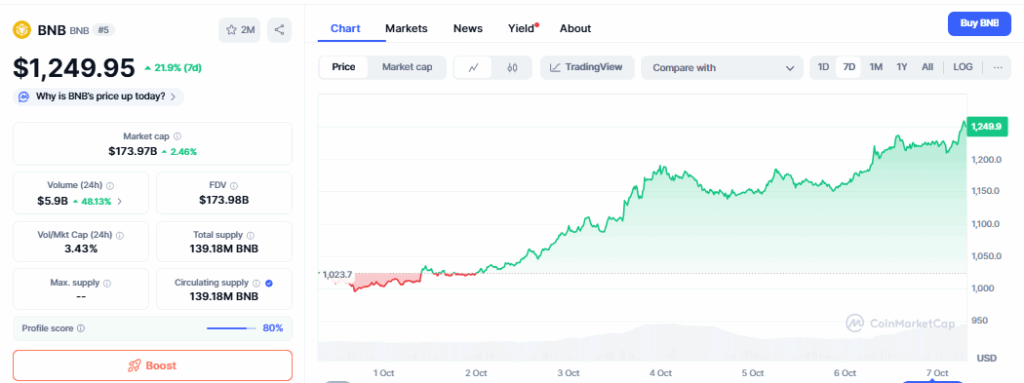 The crypto market is witnessing historic turns as BNB value hits a new high of $1,259, which is up by 21.92% in the last week.