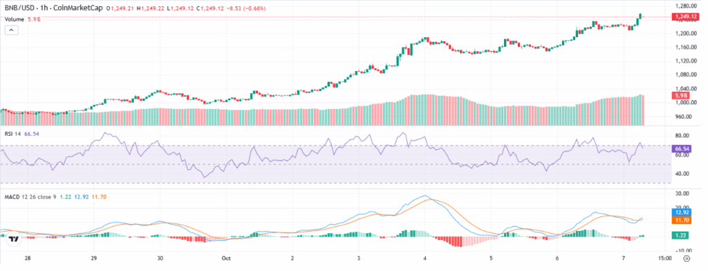 Although BNB’s meteoric rise is something to look forward to, traders need to be warned. The Relative Strength Index (RSI) is sitting at 71.43, which is in the overbought zone. This is an indicator that a correction is due, particularly if profit-taking is more aggressive. Major support levels on a pullback would be $1,100 and $1,050.