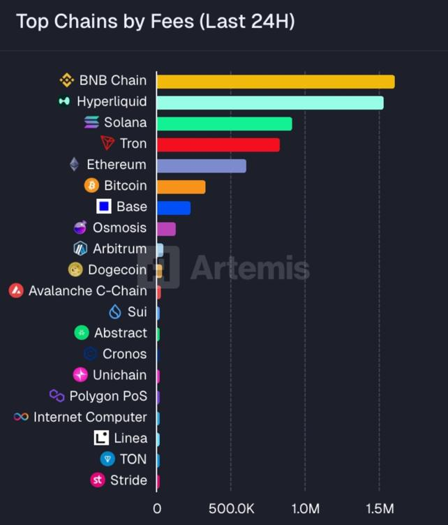 BNB Chain tops all blockchains in 24-hour fees, followed closely by Hyperliquid and Solana. This strong performance highlights the increasing demand and activity on the BNB network, further solidifying its position in the market.