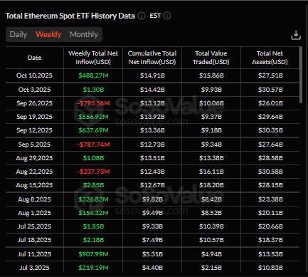 Ether (ETH) also experienced inflows, to the value of $338 million for the week. It did experience the biggest one-day outflow of $174.83 million on October 10, however. Investors considered Ether funds most at risk during the decline, said CoinShares’ Head of Research, James Butterfill.