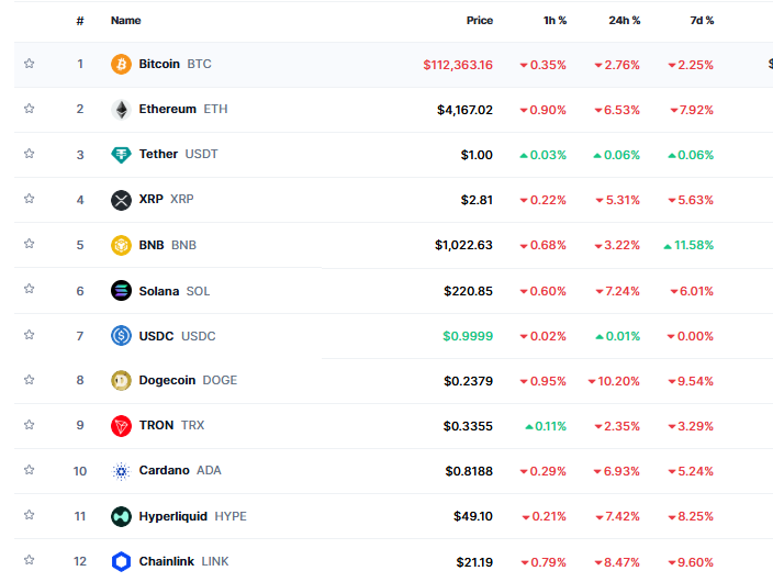 Bitcoin (BTC) dropped close to 3%, below $113,000 at the bottom. Ethereum (ETH) experienced the biggest drop among the leading cryptocurrencies, dropping close to 9%. Much of that lost value was through Ethereum position unwinds.