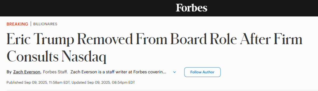 According to a Forbes article, Eric Trump will no longer be a member of fintech firm Alt5 Sigma’s board, after all. The company has stripped him of his board role following a consideration by Nasdaq. This comes after a $1.5 billion funding deal with World Liberty Financial (WLFI).
