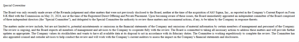 The SEC filing also contained Alt5 Sigma’s ongoing legal problems. Its Rwandan subsidiary had recently been found guilty of money laundering by a Rwandan court, which sentenced forfeiture of $3.5 million and shut down the subsidiary. Alt5 Sigma has appealed the judgment, claiming that it was unaware of the ruling until late August.