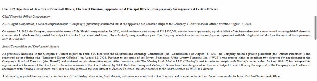 Alt5 Sigma was originally intended to have Eric Trump on its board of directors as part of its aggressive fund-raising effort. This included selling stock in an effort to raise money to purchase WLFI tokens. However, following negotiations with Nasdaq regarding how it was going to be able to meet listing standards, the company shifted gears. Zak Folkman, a WLFI co-founder, has now been nominated as a director pending stockholder approval.