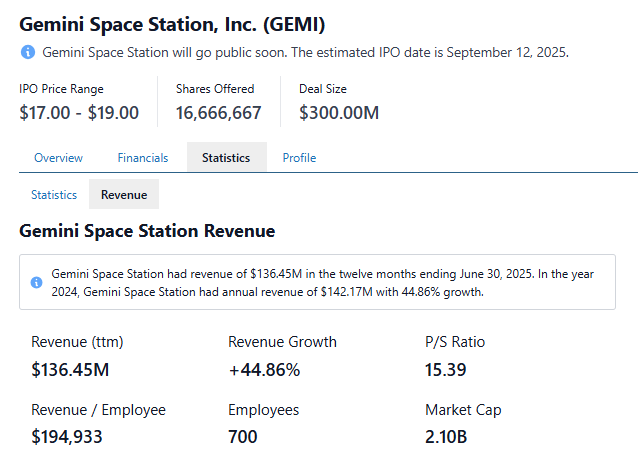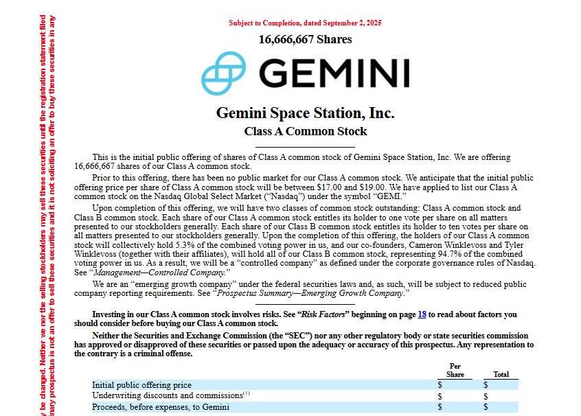 Gemini plans to raise up to $317 million through its upcoming IPO, aiming for a valuation of approximately $2.22 billion. The firm will be listed on Nasdaq under the ticker symbol “GEMI” and sell 16.67 million shares at between $17 to $19 apiece.