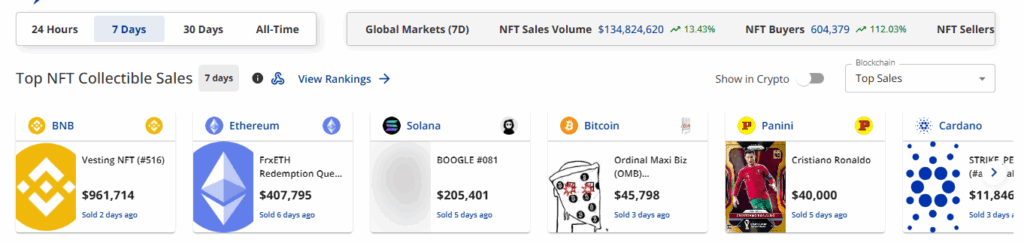 According to the current statistics, the seven-day last NFT sales volume is $134,824,620. It is a positive growth curve of the NFT marketplace. In addition to that, total NFT buyers have risen to 604,379, an impressive 112.03% increase.