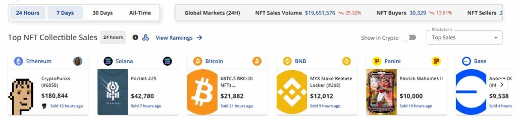 In the last 24 hours, total sales of NFTs stood at $19,723,684, which represents a 24.71% increase from normal days. The purchasers of the collectibles during the period stood at 30,323, which represented a 14.76% rise, further reflecting the trend in the market.