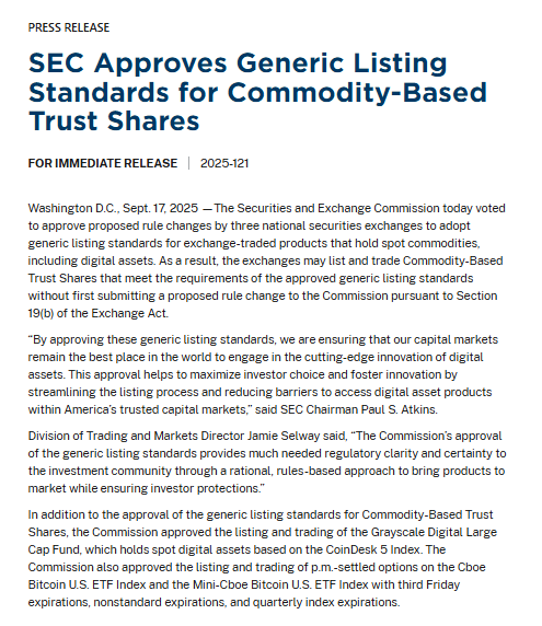 The U.S. Securities and Exchange Commission (SEC) approved fresh generic listing guidelines for cryptocurrency exchange-traded funds (ETFs), accelerating the approval process. The move, announced on September 17, 2025, enables exchanges such as Nasdaq, NYSE Arca, and Cboe BZX to list crypto ETFs without filing lengthy individual proposals. The step is bound to improve the regulatory environment for digital assets substantially.