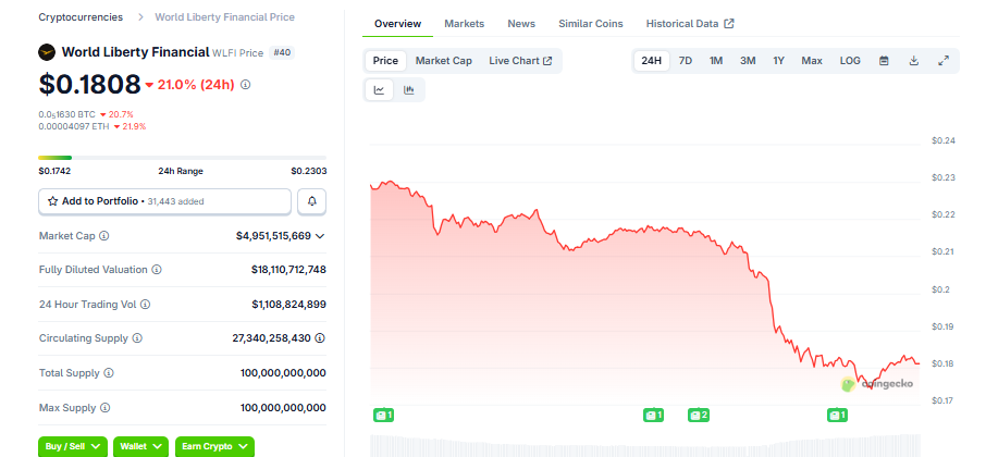 On its debut, WLFI generated an astonishing $6 billion worth of trades on Binance and had a market cap of nearly $10 billion. The hype was brief, however, as the presale investors started selling their tokens, and the price plummeted. The WLFI Token dropped to near $0.22, a staggering drop from all-time highs.