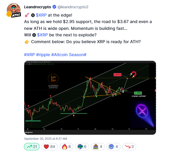 If the token is able to hold the support level of $2.95, it can try testing $3.67 and even form a new all-time high above the current high of $3.65. Analysts such as Leandrocrypto observe that sustained buying pressure and positive market signals are the cause of the bullish anticipation.